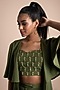 Featuring a moss green embellished crop top. It is paired with matching culottes and a cape.