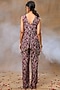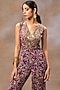 Featuring a purple high-low asymmetrical top in crepe base with geometric print and gold embroidery. It is paired with straight pants. Style this co-ord set with statement earrings and block heels for evening or festive look.