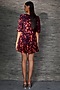 Featuring a purple draped dress in crepe base with ruffle and print.