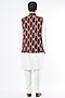 Featuring a maroon bundi jacket in cotton silk blend base with pintuck wave detail. Perfect for a festive occasion or pooja ceremony.