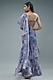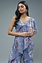Featuring a blue pre-draped ruffled sharara saree for girls in organza base with floral print and lace detailing. It is paired with a blouse. Style it with sandals and hair accessories for a sangeet or wedding ceremony.