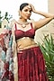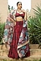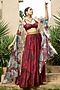Featuring a maroon tiered lehenga for girls in georgette base with embroidery. It is paired with a strappy blouse and an organza floral printed cape. Style it with sandals and hair accessories for a sangeet or wedding ceremony.