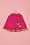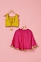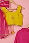 Featuring a pink lehenga for girls in blended silk base with thread, sequins, scalloped lace and tassels embroidery. It is paired with a yellow top and a yellow sequins organza dupatta. Elevate your look for any special occasion or wedding by accessorizing this designer lehenga set with sandals and cute hair accessories. It's the perfect way to add a touch of glamour and elegance to your ensemble.