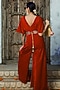 Featuring a red jumpsuit for girls in velvet base with a v-neckline. It is paired with a gota embroidered belt. Style it with a sling bag and sandals for a birthday party.