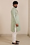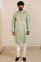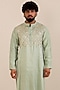 Featuring a teal green kurta in pure dupion silk base with gota hand and machine embroidery. It is paired with cotton pants. Style it with classic loafers and a watch for a refined traditional look, Perfect wear for festive gatherings or sangeet nights.