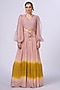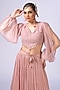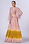 Featuring a blush pink and mustard ombre skirt in chiffon base. It is paired with a textured organza blouse having a balloon sleeve top. Accentuate it with statement earrings and block heels for festive occasions or mehendi ceremonies.