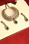 Featuring a gold finish temple necklace studded with garnet and CZ, set in 92.5 sterling silver. It is paired with a matching pair of earrings. Add a touch of sparkle to your ensemble, perfect for festive occasions, weddings or sangeet ceremony.