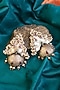 Featuring a pair of white finish temple jhumka earrings studded with kemp stones and pearls, set in 92.5 sterling silver. Perfect wear for a festive occasion or pooja ceremony.