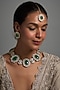 Featuring a two tone finish necklace studded with kundan polki and emerald stones, set in brass. It is paired with a matching pair of earrings and a maangtikka. Perfect wear for festive occasions or wedding ceremonies.