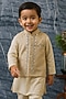 Featuring a gold bandhgala jacket for boys in pure tissue base with hand embroidery. It is paired with a kurta and pyjama pants. Style it with a watch and pair of mojaris for a wedding, sangeet or engagement ceremony.