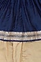 Featuring an indigo angrakha kurta in organic cotton, handwoven chanderi and silk base with beaten gold hand embroidery. It is paired with contrasting beige dhoti pants.
