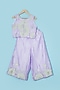 Featuring a lilac crop top in organic cotton, handwoven chanderi and silk base with silk thread and zari floral hand embroidery, including sequins and pearl details. It is paired with matching embroidered palazzo pants.