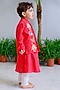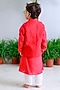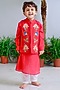 Featuring a red bandhgala for boys in handwoven chanderi base with hand embroidery. It is paired with a kurta and organic cotton ivory pyjama pants. Style it with a watch and pair of mojris for a wedding, sangeet or engagement ceremony.