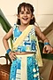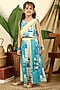 Featuring a blue lehenga for girls in cotton base with hand block print and tassels detailing. It is paired with a matching sleeveless blouse having an attached cream cotton mul dupatta and criss-cross tie-up detail.