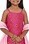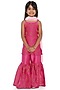 Featuring a rani pink spaghetti-strap short kurta for girls in cotton silk chanderi base with golden khadi and hand block print. It is paired with sharara pants and a light pink dupatta having scalloped golden zari, thread and tassels detailing. Style it with sandals and cute hair accessories for a festive occasion or a pooja ceremony.