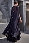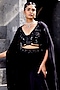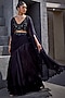 Featuring a black corset blouse in viscose satin organza and georgette base with glass hand embroidery. It is paired with a matching skirt and a cape.