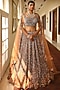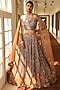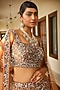 Featuring a peach flared lehenga in silk, satin organza, and net base with sequins embroidery. It is paired with a matching blouse and an embroidered dupatta.