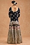 Featuring a black kurta in viscose chinon chiffon base with multi-colored thread, sequins and zari embroidery. It is paired with a sharara and a dupatta. Accentuate it with polki jewellery and block heels for a wedding or sangeet ceremony.