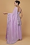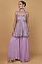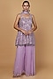 Featuring a lavender peplum in net base with mirror work. It is paired with georgette sharara pants and a dupatta. Accentuate it with dangler earrings and block heels for festive occasions or weddings.