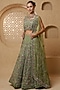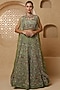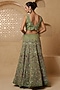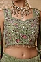 Featuring a leaf green lehenga in crepe tissue base with thread and mirror work. It is paired with a blouse and a pure organza embellished cape. Accentuate it with dangler earrings and heels for a wedding or mehendi ceremony.