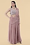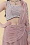 Featuring an onion pink draped skirt in crepe base. It is paired with an embroidered blouse. Style it with statement earrings and heels, perfect for a sangeet or wedding ceremony.