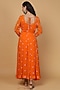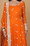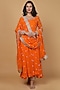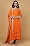 Featuring an orange anarkali in georgette base with motifs and hand work. It is paired with katan silk pants and a georgette dupatta. Accentuate it with dangler earrings and heels for a festive occasion or a pre-wedding ceremony.
