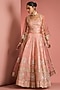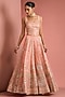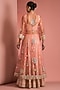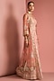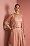 Featuring a peach cape in net base with embroidery. It is paired with a viscose georgette applique work blouse and sharara pants. Accentuate it with dangler earrings and heels for a festive occasion, reception, sangeet or engagement ceremony.