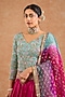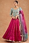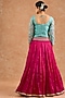Featuring a pink flared lehenga in crushed viscose silk base. It is paired with a teal silk hand embroidered blouse and a viscose organza dupatta. Accentuate it with polki jewellery and block heels for festive soirees, daytime functions or weddings.