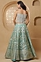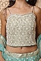 Featuring a teal blue lehenga in brocade base with pearl work. It is paired with an organza noodle strap blouse and an organza dupatta. Accentuate it with dangler earrings and heels for a wedding or sangeet ceremony.