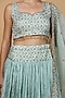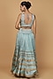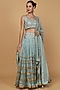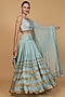 Featuring a teal lehenga in crush viscose silk base with block print and cutdana embroidery. It is paired with a blouse and an organza dupatta. Accentuate it with dangler earrings and block heels for weddings or sangeet ceremonies.