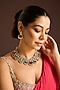 Featuring an antique gold finish necklace necklace studded with multi-colored stones and crystals, set in mixed metal. It is paired with a matching pair of jhumka earrings. Add a touch of sparkle to your ensemble, perfect for wedding ceremonies or festive celebrations.