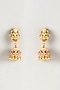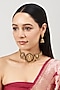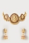 Featuring a gold finish Lakshmi temple necklace studded with golden beads and ruby colored kemp stones, set in brass. It is paired with a matching pair of earrings.