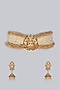 Featuring a gold finish temple necklace studded with beads and pearls, set in brass. It is paired with a matching pair of earrings.