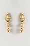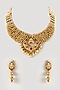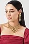 Featuring a gold finish temple necklace studded with emerald kemp stones and golden beads, set in brass. It is paired with a matching pair of earrings.