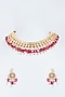 Featuring a 22 kt gold plated necklace studded with kundan polki, ruby beads, and pearls, set in mixed metal. It is paired with a matching pair of earrings.