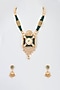 Featuring a 22kt gold plated long necklace studded with kundan polki, emerald stones and golden beads, set in mixed metal. It is paired with a matching pair of earrings.