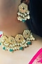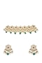 Featuring a 22 Kt gold plated handcrafted choker necklace studded with kundan polki, emerald colored stone, and pearl, set in mixed metal. It is paired with a matching pair of stud earrings.