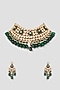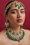 Featuring a 22kt gold plated necklace studded with kundan polki, agates and beads, set in mixed metal. It is paired with a matching pair of earrings and a matha patti.