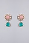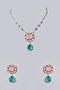 Featuring a 22kt gold plated pendant necklace necklace studded with kundan polki, green and pink stones, set in mixed metal. It is paired with a matching pair of jhumka earrings. Add a touch of sparkle to your ensemble, perfect for wedding ceremonies or festive celebrations.