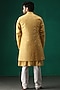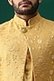Featuring a mustard bundi jacket in stretch jacquard base with embroidery. It is paired with a matching silk blend kurta and pyjama pants.