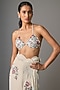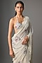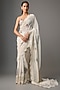 Featuring a beige saree in silk and organza base with pearl and thread embroidery. It is paired with an embroidered blouse. Accentuate it with heels and statement earrings for festive occasions, sangeet or cocktail ceremonies.