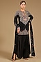 Featuring a black short kurta in dupion base with threadwork. It is paired with satin pants and an organza dupatta. Accentuate it with dangler earrings and heels for a festive occasion, cultural event, wedding or engagement ceremony.