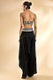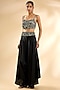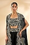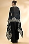 Featuring a black cape in satin base. It is paired with a blouse and a skirt. Accentuate it with bold gold or onyx statement earrings, a sleek embellished clutch and elegant heels for a stylish ensemble, ideal for cocktail evenings, festive gatherings or wedding functions.