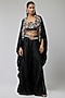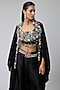 Featuring a black cape in silk base. It is paired with a top and pants. Accentuate it with dangler earrings and heels for a festive occasions or wedding ceremonies.