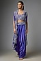 Featuring a blue butterfly cape in silk and organza base with mirror work. It is paired with an embroidered top and satin pants. Accentuate it with statement mirror work earrings, metallic heels and a sleek clutch for a striking ensemble, ideal for sangeet celebrations, cocktail evenings or pre-wedding festivities.