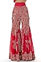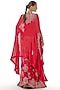 Featuring a deep red cape in georgette base with embroidery. It is paired with organza gharara pants and a china dupion waistcoat. Accentuate it with statement earrings and flats for festive occasions.