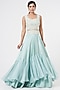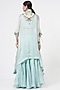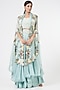 Featuring a light blue butterfly cape in organza base with silver thread work and 3D florals. It is paired with a matching dupion blouse having silver dori work and a silk organza tiered skirt.