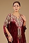 Featuring a maroon kaftan in velvet base with kashida threadwork. It is paired with pants. Accentuate it with dangler earrings and heels for a festive occasion, cultural event, wedding or engagement ceremony.