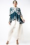 Featuring a green ruffled cape in dupion silk base with lace, pearl, and thread work. It is paired with contrasting white harem pants.