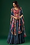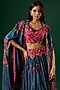 Featuring a peacock blue lehenga in chanderi base. It is paired with a red silk blouse and a dupion butterfly cape having multi-colored thread work. Accessorize this designer lehenga set with statement jewellery and heels for weddings, sangeet or any festive occasion. .